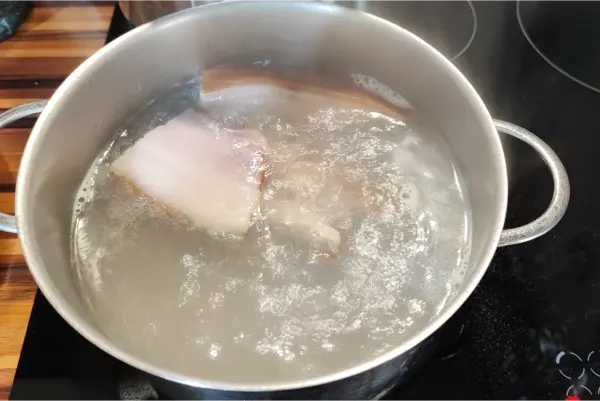 Zuerst wird das Fundament für den Geschmack gelegt. Den Bauchspeck im Ganzen in einen großen Topf geben und mit etwa 1,5 Litern kaltem Wasser aufgießen. Das kalte Wasser sorgt dafür, dass das Fleisch langsam Temperatur annimmt und das maximale Raucharoma an die Brühe abgibt. Das Wasser zum Kochen bringen und die Hitze sofort auf ein sanftes Simmern reduzieren. Den Speck ca. 20 bis 30 Minuten ziehen lassen, bis sich eine kräftige, natürliche Fleischbrühe gebildet hat.