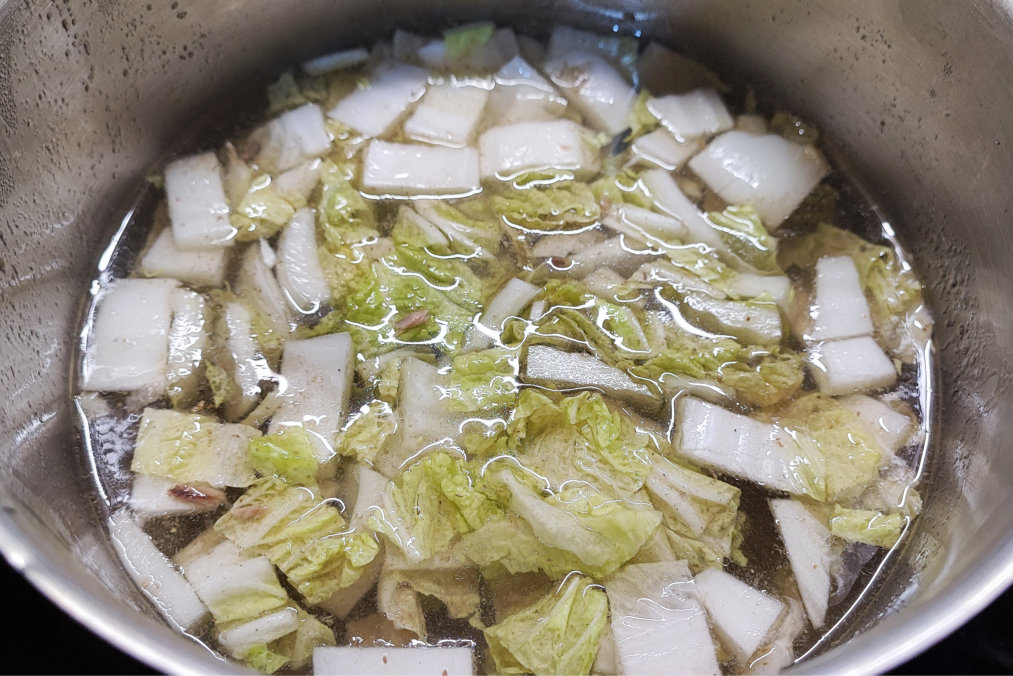 • Gib den grob gehackten Chinakohl (Baechu / 배추) hinzu.